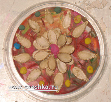 Намазывали мягкий пластилин на крышку от сметаны, скатывали шарики из пластилина разной величины, и украшали этими шариками и семечками тыквы, дыни, арбуза и пр. Можно использовать для этой поделки все, что подскажет фантазия.