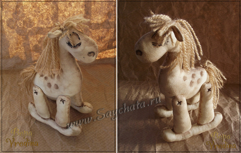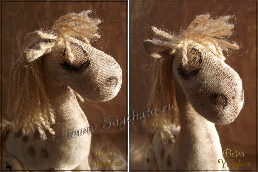 - Сшита из хлопка, тонировка кофе и акрил, грива из шерсти.