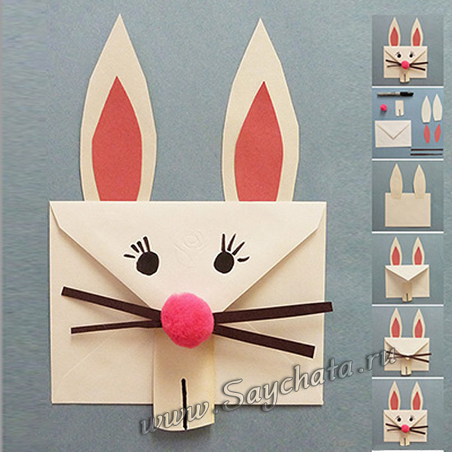 - Переверните конверт и приклейте «зубы», а так же «усики» зайчика.